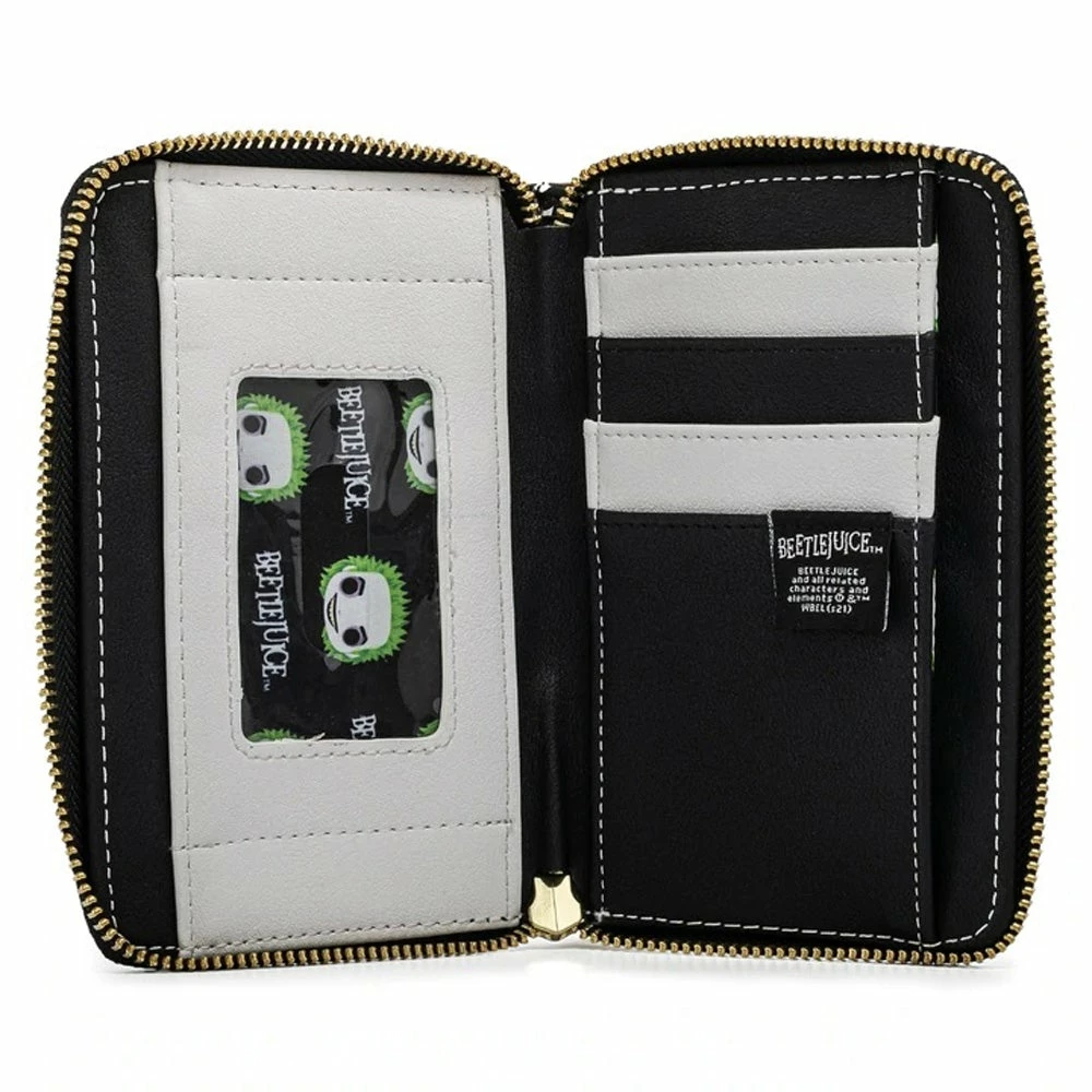 The Funko Pop! by Loungefly Beetlejuice Zip Around Wallet is made of vegan leather (polyurethane). Wallet zips closed, has sturdy metal hardware, and features printed details. Take note of the coordinating pattern of the inside lining fabric.