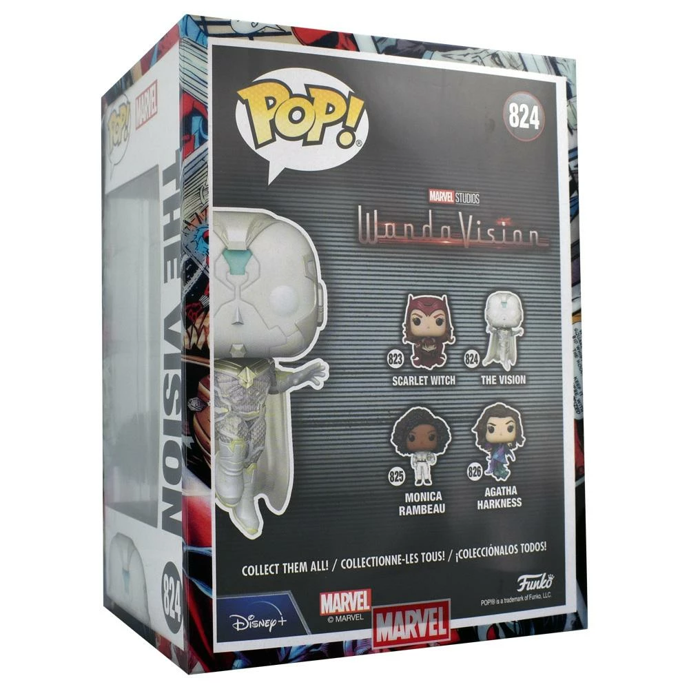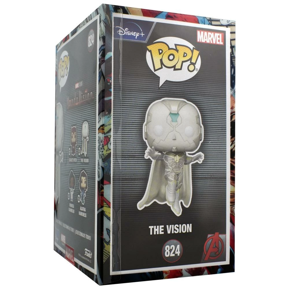 This Special Edition The Vision (GITD) Funko Pop! Vinyl Figure comes with a Free PPJoe Marvel Sleeve, Pop Protector and UV (Black Light) Torch. He measures approximately 3 3/4-inches tall.