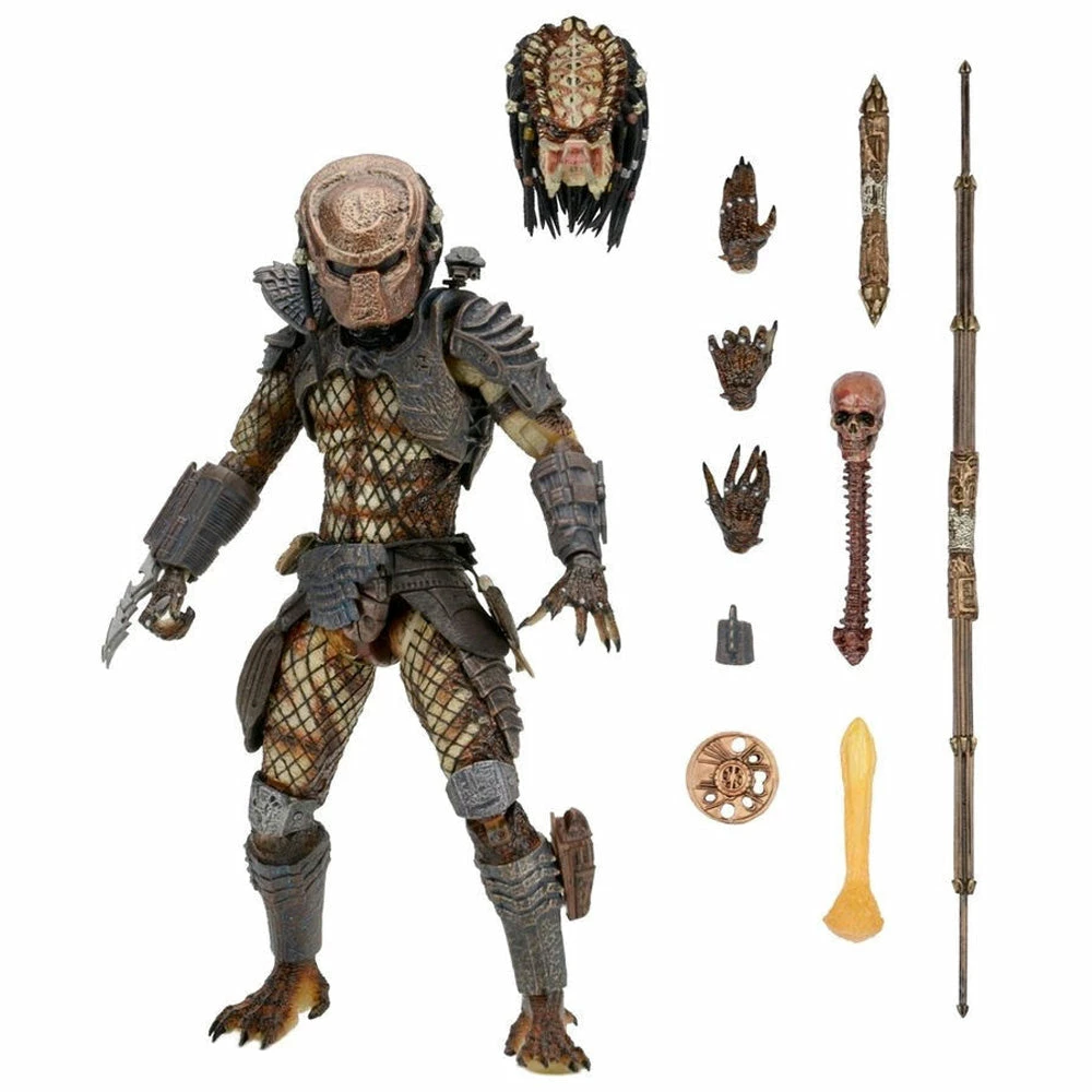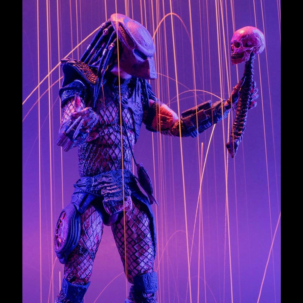 The chilling creature has received “Ultimate” treatment, including additional articulation in the biceps (bicep swivels), elbows (double elbow joints) and torso, plus an opening gauntlet! Comes with 2 interchangeable heads and 5 hands, plus bloody skull and spine, smart disc, removable net launcher, cannon blast effect, collapsed spear and extended spear.