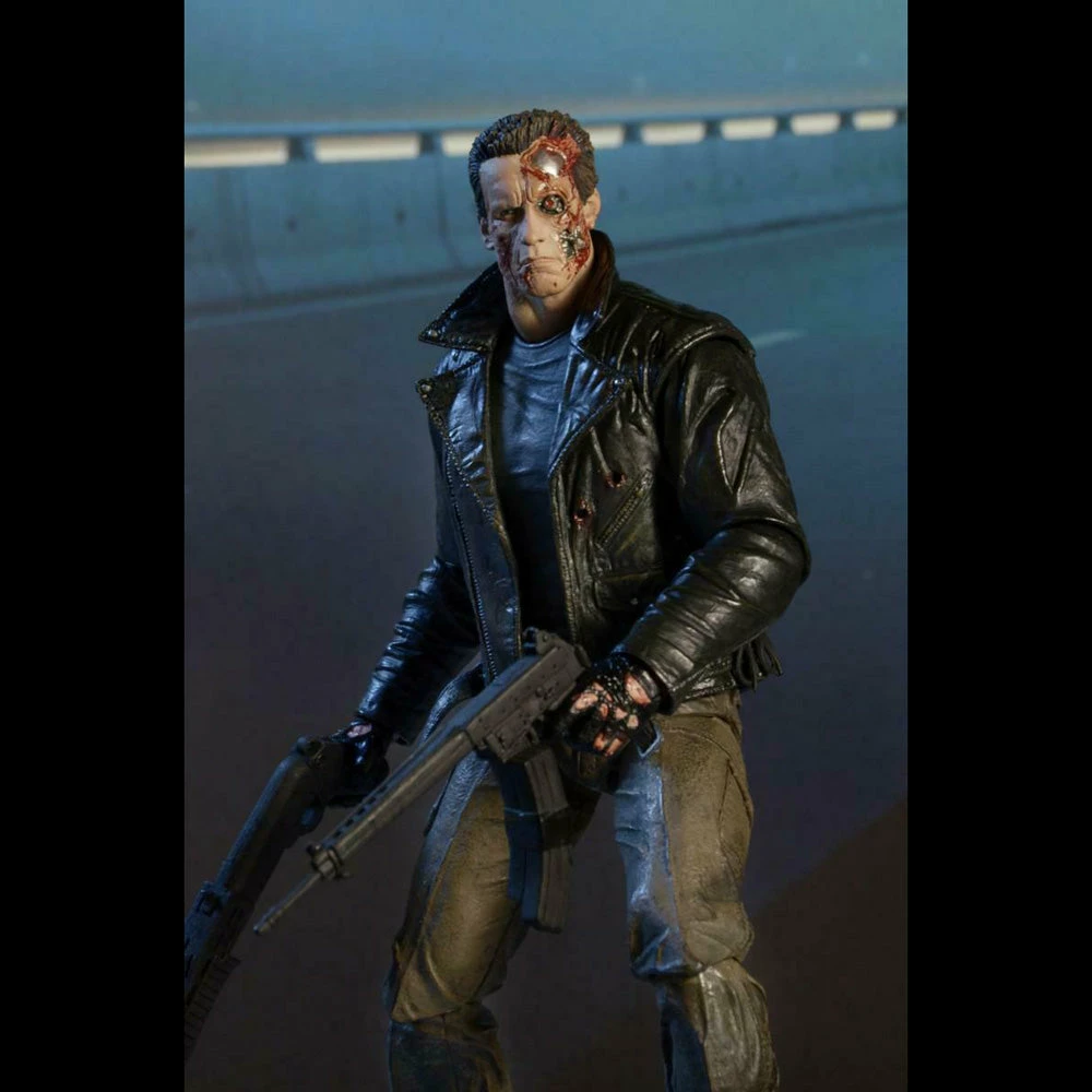 The Ultimate Police Station Assault T-800 features a detailed, bullet-riddled motorcycle jacket and bears the likeness of Arnold Schwarzenegger. The deluxe 7” scale figure has over 25 points of articulation, 3 interchangeable heads, 2 pairs of hands, and SPAS-12 shotgun, AR-18 assault rifle, and Smith & Wesson Model 15 handgun accessories.